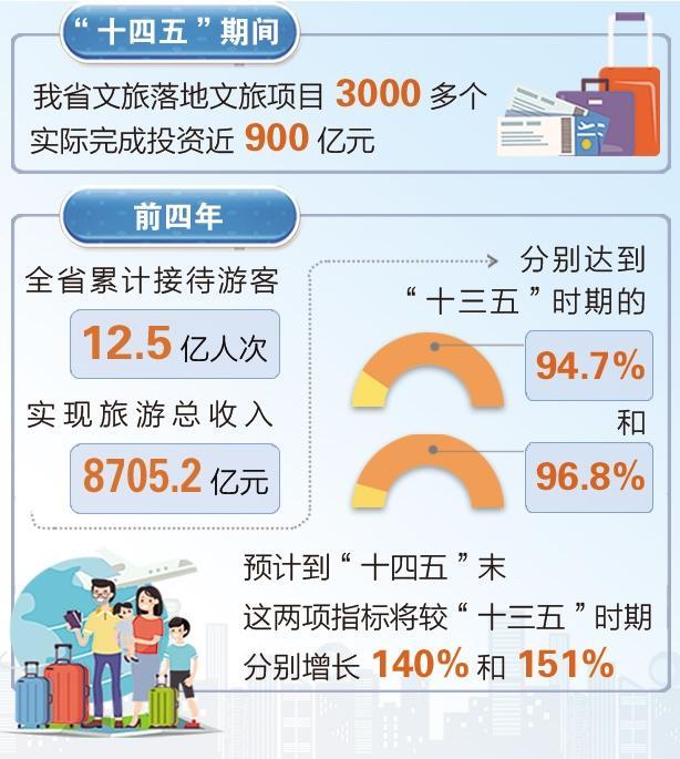 “十四五”以来,我省文旅通过扩大招商引资、加大政府投入,落地文旅项目3000多个,实际完成投资近900亿元。前四年,全省累计接待游客12.5亿人次、实现旅游总收入8705.2亿元,分别达到“十三五”时期的94.7%和96.8%;预计到“十四五”末,这两项指标将较“十三五”时期分别增长140%和151%。
