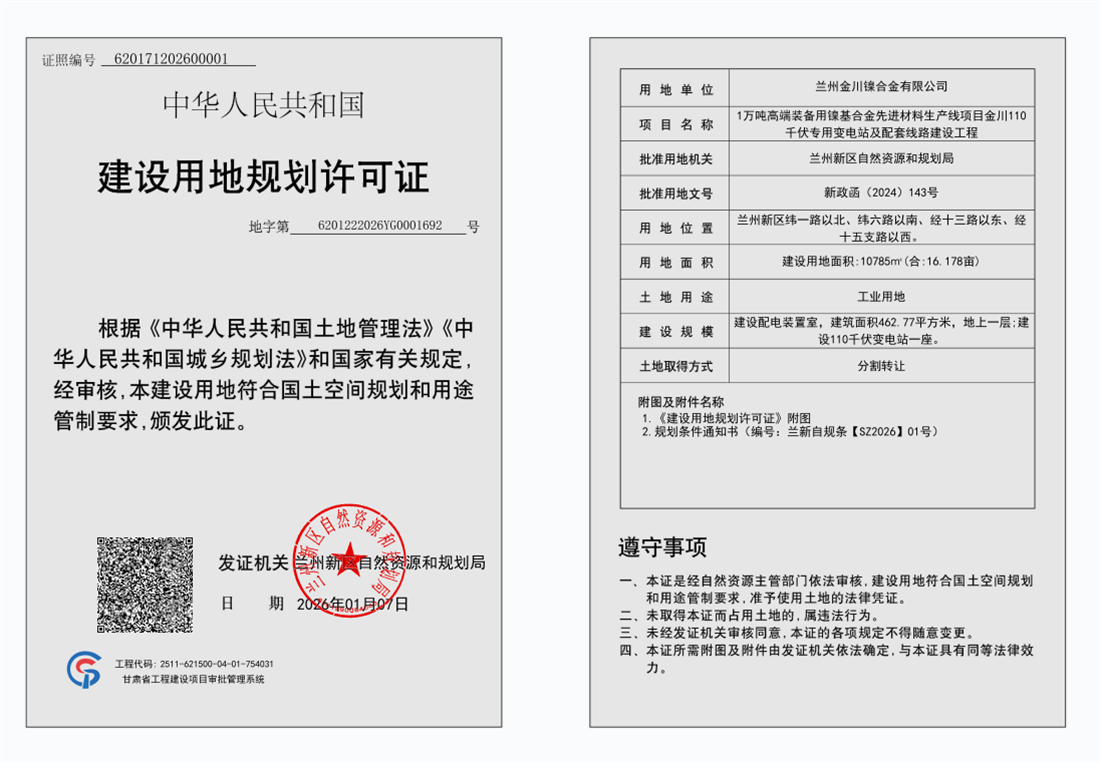 用地单位:兰州金川镍合金有限公司