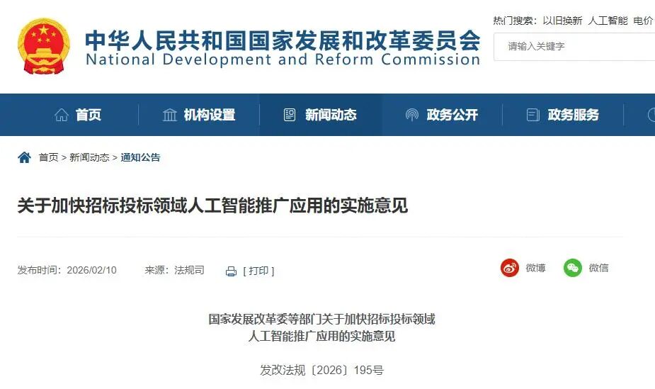 为贯彻落实党中央、国务院关于深化招标投标改革和实施“人工智能+”行动的部署要求,近日,国家发展改革委、工业和信息化部等8部门联合印发《国家发展改革委等部门关于加快招标投标领域人工智能推广应用的实施意见》(以下简称《意见》)。
