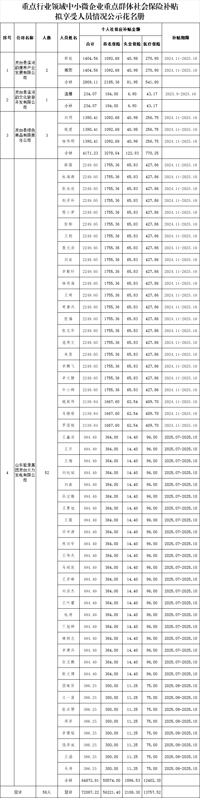 根据甘人社通〔2025〕255号《关于加大力度落实稳就业政策措施的通知》精神,经我单位发布公告、企业自主申报、资料审核,现有灵台县溪河韵康养产业发展有限公司等4家企业58人符合该补贴政策规定,拟给予该4家企业58人个人社会保险费补贴合计72087.22元。现将符合社保补贴的企业及人员姓名、补贴金额等情况面向社会各界公示,接受社会监督。