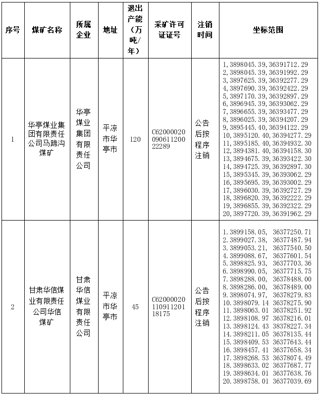2.甘肃省2025年关闭退出煤矿井田范围坐标、注销采矿许可证公告事项表