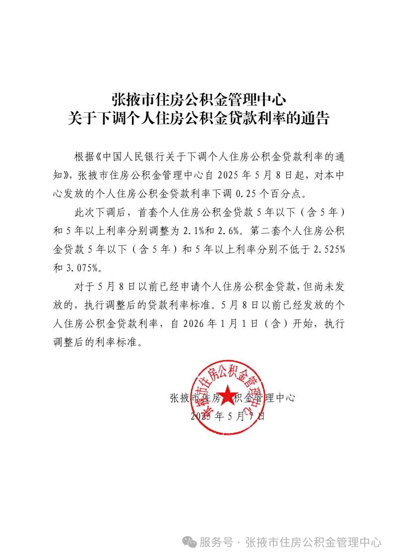张掖市住房公积金管理中心关于下调个人住房公积金贷款利率的通告