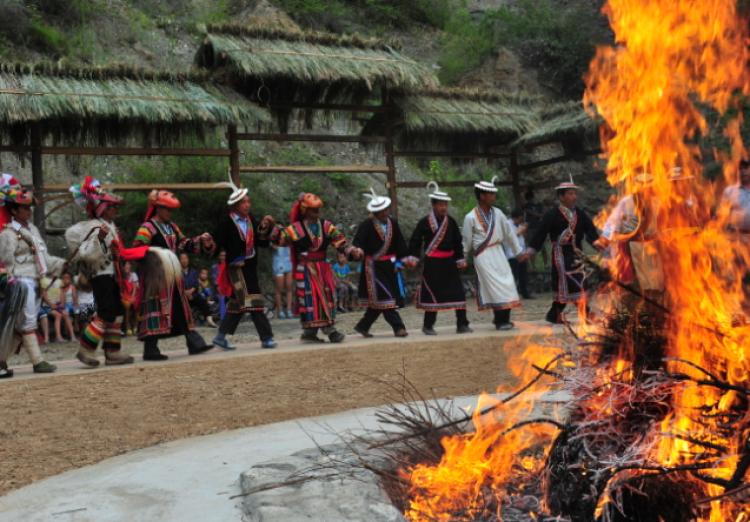 白马人的火圈舞,又称圆圆舞,白马语称呆舟,是白马人最喜欢的一种自娱自乐的集体舞蹈。黄发白首齐醉舞,携手踏歌程复程,就是文人墨客笔下对火圈舞最形象的描述。古时,白马人常以山头为营,并点燃篝火,以防袭击。白马人为消除疲劳,以歌舞自娱,通宵达旦,这便是火圈舞最早的雏形。久而久之,经过不断发展演变,便形成了现在的火圈舞。舞时,点燃篝火,全村男女老少手拉手、肩并肩,连成一个大圆圈,围着熊熊大火歌舞。舞步简练明快,随圈左右盘旋,三步一蹴,踢一次腿。边舞边唱,气势磅礴,时而高亢粗犷,似有裂云惊天之势,时而悠扬婉转,如同行云流水。