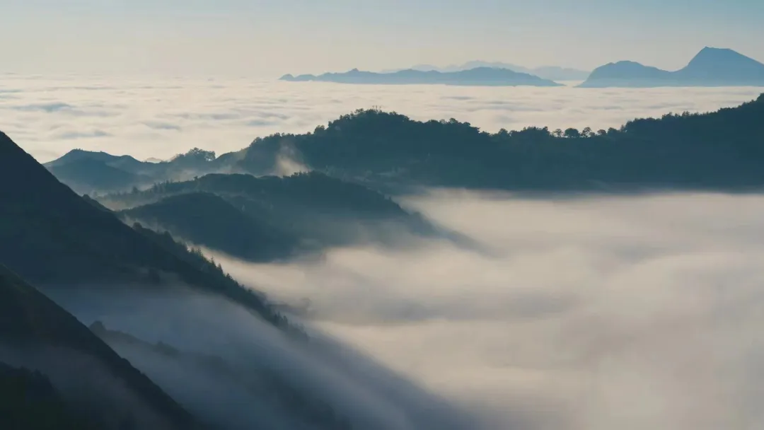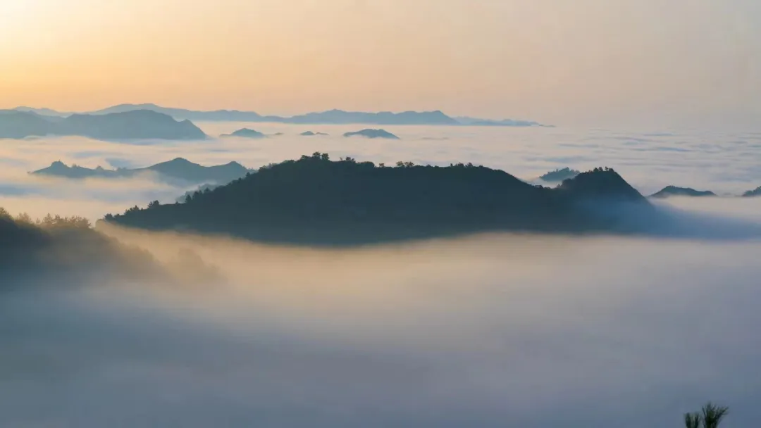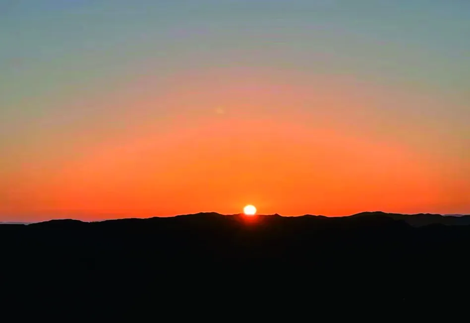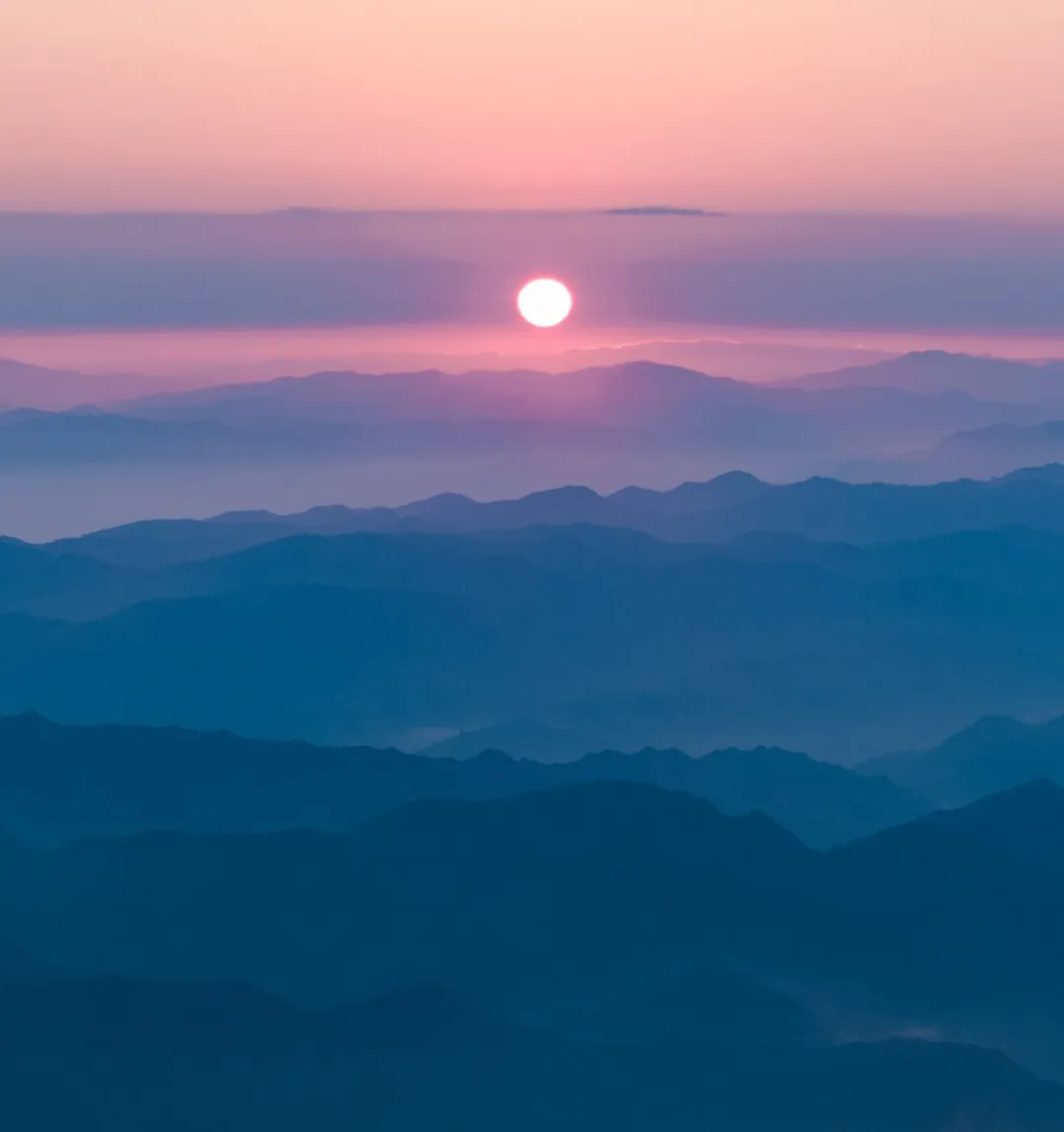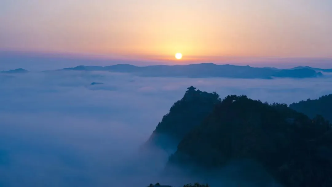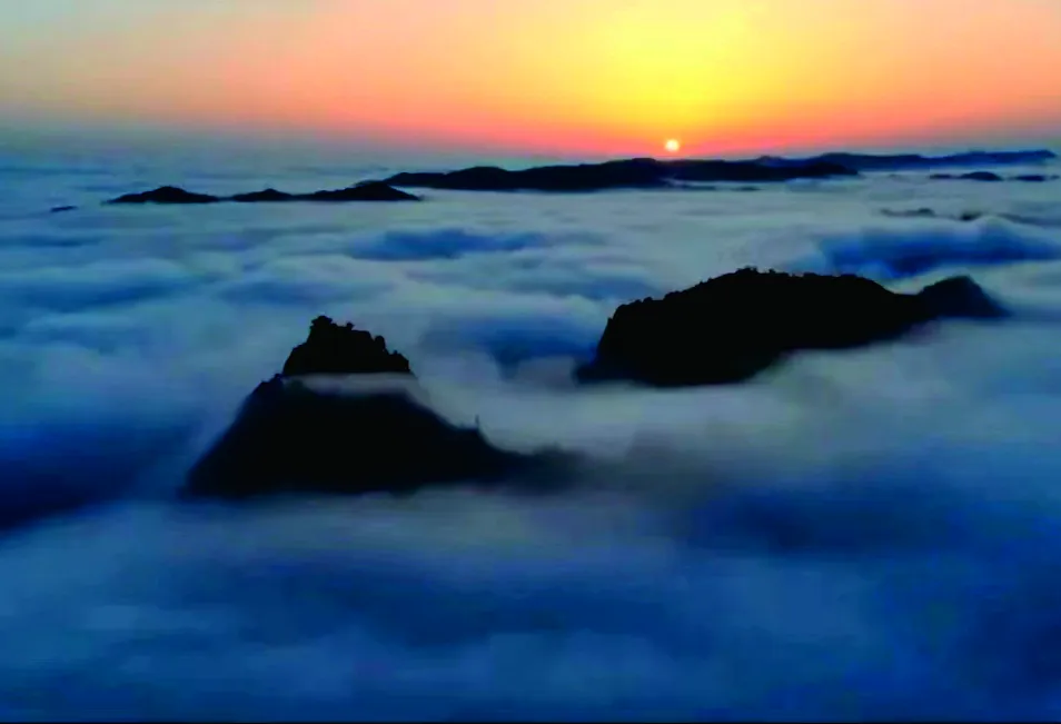 当一轮黄色的骄阳从云海慢慢升起,真有毛泽东“江山如此多娇,引无数英雄竞折腰”的豪迈,白色的云海上,露出的黑色山头,好似茫茫大海上露出的礁石,此时此刻分不清是在大海边还是天宫上。黄色的骄阳,抑或红色的朝曦,又或紫色的朝阳,与远处的山连成一片,如此壮丽的美景,让人流连忘返。