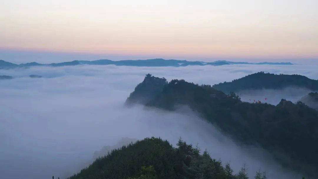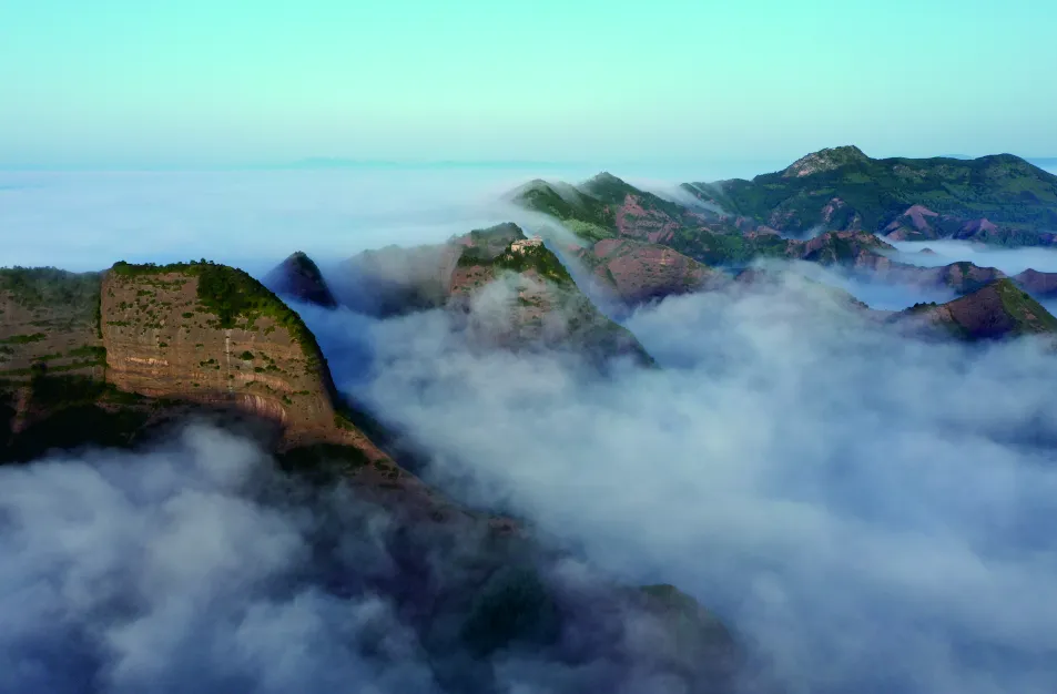 日出后,茫茫云海笼罩了整个云华山山头,丹霞地貌与云海碰撞出了一幅奇观,云华山仅露出最高的山头,其余全都不见,云海之上,宛若一幅流淌的画卷,一会万马奔腾,一会风吹草地见牛羊;又宛如童话世界,看狮子在追着老虎跑,看那里又堆起了一座城堡;瞬息万变,蔚为壮观,云卷云舒,如梦似幻。