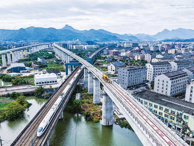 杭台高铁温玉段桥隧比高达90.34%,需穿越13座总长约18公里的隧道、跨越17座总长约16公里的桥梁。项目建成运营后将填补玉环市铁路空白,形成台州“县县通铁路、铁路网全覆盖”的交通格局。图为2025年11月5日,在杭台高铁温玉段施工作业现场,中铁十四局工作人员操作长轨牵引车进行铺轨作业。 新华社记者 徐昱/摄
