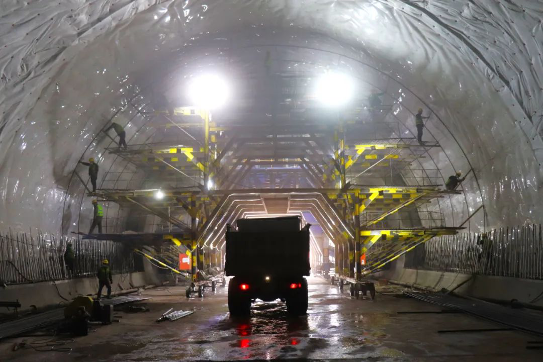 面对各项施工难题,以赵宏耀、王峰为主管的项目团队从优化施工方案入手,科学配置资源要素、创新施工工艺、引入信息化管理手段等,不断强化全过程动态管控,确保安全有序高效推进施工。“开挖过程中,我们严格执行‘管超前、严注浆、弱爆破、短进尺、快封闭、强支护、早闭合、勤量测’的原则,通过仰拱液压栈桥+液压曲面模板、仰拱钢筋定位卡具+“七线上墙”制度,实现了关键工序的平行作业和精准控制;通过液压可调式二衬台车+可视化堵头模板+空洞预防监测技术+带模注浆工艺,确保了二衬施工质量。”项目负责人赵宏耀介绍说。
