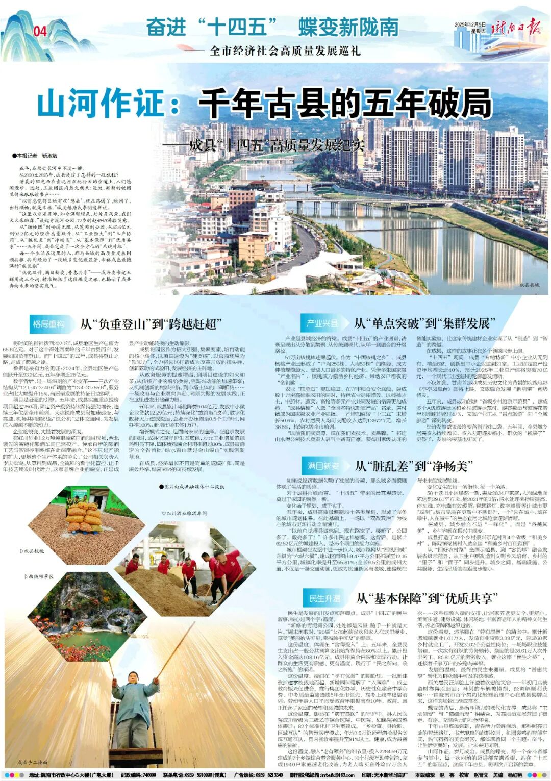 从“肠梗阻”到畅通无阻,从荒滩到公园,从65.6亿元到93.2亿元的经济总量跃升,从“工业独大”到“三产协同”,从“脏乱差”到“净畅美”,从“基本保障”到“优质共享”……五年间,成县完成了一次全方位的“系统升级”。