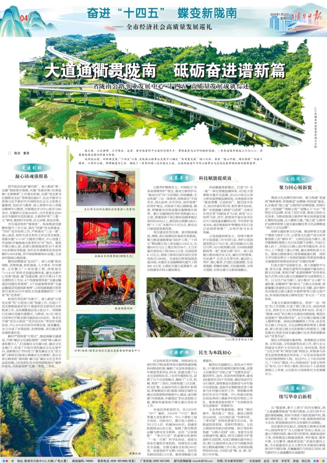 陇之南,重峦叠嶂,江河奔流。这里,曾回荡着阴平古道的马蹄声声,萦绕着茶马互市的驼铃悠扬;如今一条条道路串联起山川与人心,承载着陇南发展的希冀与梦想。 风雨洗征程,回眸满堂春。“十四五”以来,省陇南公路事业发展中心锚定高质量发展核心目标,秉承“逢山开路、遇水架桥”的奋斗精神,以养好公路、保障畅通为己任,铺就了一条条四通八达的康庄大道,在砥砺奋进中书写公路事业与区域发展同频共振的崭新篇章。 党建引领,凝心铸魂强根基 筑牢政治忠诚“硬内核”。深入推进“第一议题”制度落实落细,实施“党委决策+纪委监督+支部督抓”工作落实机制,完善“党支部书记督抓安全法”等典型经验6个。扎实开展学习贯彻习近平新时代中国特色社会主义思想主题教育、党纪学习教育、深入贯彻中央八项规定精神学习教育,开展理论学习中心组学习80余次、专题研讨交流30余次。召开党委会议90余次专题研究党的建设、公路养护和“三重一大”事项,做到科学决策、民主决策、依法决策。 夯实基层组织“强堡垒”。纵深推进党建整体提升三年行动,深化“四强”党支部建设、“四好”党员培育工作,严格落实“三会一课”、谈心谈话、组织生活会和民主评议党员制度,创新实施“1+7+N”主题党日模式,中心党建工作连续5年被陇南市委考评为“好”等次。策划开展公路心语、沿着公路看陇南等30个系列200余期宣传报道,每年在外部媒体发表宣传稿件1000余篇,其中国家级媒体60余篇,主动讲好陇南公路故事。 擦亮品牌建设“金名片”。深入实施“政治领航、思想铸魂、组织强基、人才固本、作风增效、文化聚力”六项党建工程,持续深化“1+14+N”矩阵式党建品牌体系,健全完善中心党委“陇道·魂”党建品牌,迭代升级14个党支部特色工作法,4个党建案例荣获“交通运输基层党建优秀案例”、3个党建案例荣获“交通运输基层党建创新案例”;2项党建课题分别荣获甘肃省2025年度机关党建课题研究“三等奖”和“优秀奖”。 彰显作用发挥“先锋力”。深入推进“示范党支部”和“示范党小组”创建工作,完成17个党支部换届选举及2个离退休党支部党员关系转隶工作,灵活调整基层党小组32个。持续推行区域化党建共建模式,与跨省、市(区)相关兄弟单位开展支部共建活动100余次。常态化开展“党员示范岗”“党员突击队”等党性实践活动,中心470余名党员冲锋在前、昼夜鏖战,全力完成了水毁抢险、防滑保畅、项目建设等急难险重任务。 解好严管厚爱“方程式”。推进清廉交通建设,升级“廉洁文化虚拟展馆”,培树“路小廉3D虚拟数字人”,打造廉洁文化墙13处、廉洁文化走廊7个,形成了开放共享的廉洁文化实景平台。创新推出《“四向发力”激发廉洁文化“活力源”》案例及《陇南公路廉洁文化画册》,承办全省公路系统“清风路·廉行远”廉洁文化艺术作品巡回展,2支宣讲队伍分别荣获陇南市“涵养好家风,共筑家国梦”比赛一等奖、二等奖。 建养并重,科技赋能提质效 公路养护精准发力。牢固树立“全寿命周期养护”理念,推动公路养护从“被动应对”向“主动预防、科技赋能、生态和谐”三位一体转型,持续深化“中间夯实、两头延伸、次年评估、闭环管理”的养护理念,对国省干线公路路基、路面、桥隧涵及沿线设施实施精细化养护。累计实施预防性养护里程超130.2公里,普通国省干线公路优良路率稳定保持在90%以上,路况综合指数(MQI)较“十三五”末提升5个百分点,群众出行舒适度显著提升。 项目建设攻坚克难。面对陇南暴雨、滑坡、泥石流频发的地质灾害挑战,聚力推进道路修复与防护工程。“十四五”期间累计投入资金超12.02亿元,实施500万元以上重点项目58个,大力实施灾害防治工程2660.2公里,完成投资6.27亿元,借助工程项目逐年消化灾害风险点1389处。完成危旧桥梁加固改造29座;实施安全设施精细化提升工程985.6公里,公路抗灾能力显著提升,成功抵御多次特大暴雨袭击。 科技赋能革新模式。打造“空-天-地”一体化智能监测体系,对3处大型滑坡实施专业监测,在G212线关头坝大桥安装智能监测系统,实现地质灾害“提前预警、主动防控”。强化技术攻关,成功申请专利7项、软件著作权6项,推广水泥混凝土路面“白改黑”、全深式冷再生等“四新技术”51项,研发“五小发明”6项,其中,桥梁顶升复位技术在G75兰海高速武罐段应用,节约养护成本30%;废旧轮胎防护桥墩技术在白龙江沿线桥梁推广,实现环保与安全双赢。 示范创建持续发力。持续开展养护示范创建三年专项行动,养护示范创建里程达1776公里,成功创建G212线甘川界、G212线高楼山段、S209线南腊路段等一批“美丽公路”名片。深入挖掘公路沿线历史文化,融合自然景观、历史遗产、红色文化等内容,通过匠心养护,倾心服务,打造红色旅游路、生态景观路、桥隧科创路、灾防提质路、文明示范路,实现交通与文旅深度融合。 守安护畅,民生为本践初心 应急体系筑牢屏障。持续深化完善甘陕川等6家相邻省市路网保通保畅协同联动机制,编制了应急体系建设五年规划等系列丛书5本,组建完善了13支应急抢险队伍,1支对外援助队伍,设置了21个应急保畅点,确保了“人员、机械、物资”三到位。持续构建三点支撑、四支扩散、全域协作的公路养护新格局,积极推进甘肃(陇南)