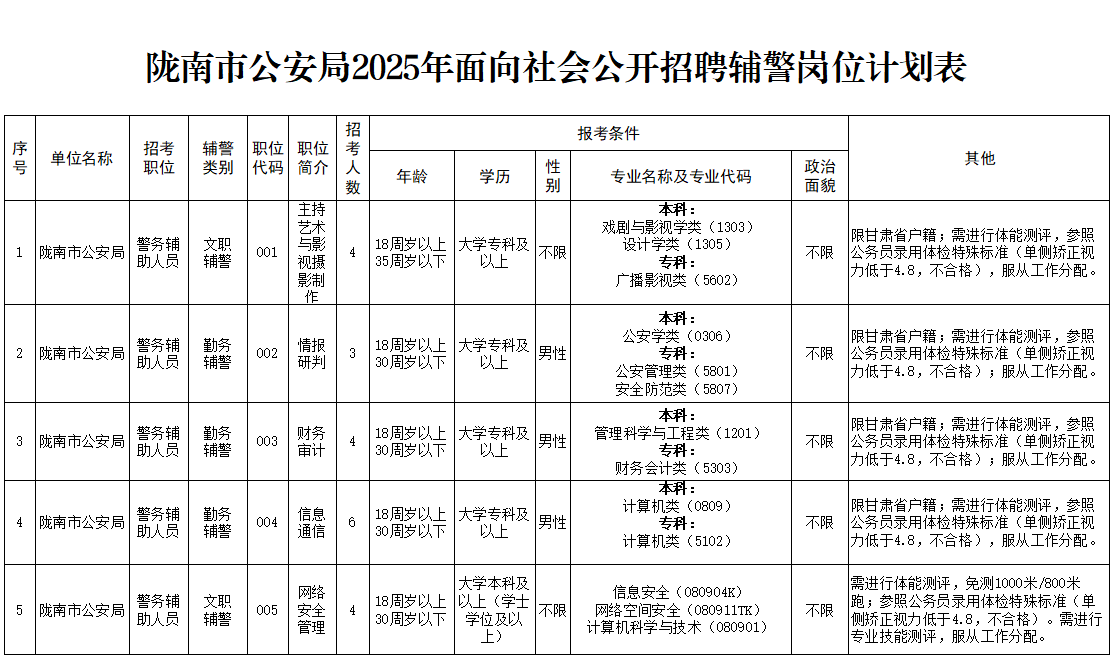招聘人员需满足上述基本条件外,还需满足报考岗位要求的其他条件,具体以“陇南市公安局2025年面向社会公开招聘辅警岗位计划表”为准。
