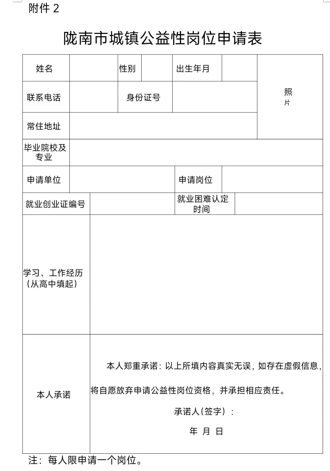 2.报名地点:采取网上报名方式,报名人员请将《陇南市城镇公益性岗位申请表》发送到邮箱:szgg123@163.com。(报名人员建立一个以“报名人员姓名+报名单位”为名的文件,如王XX+陇南市XXX局)