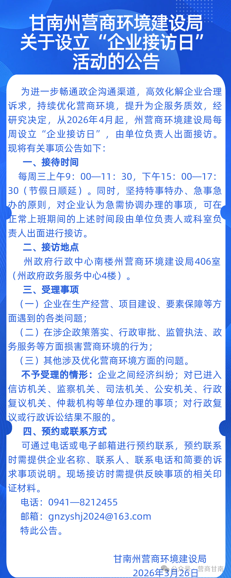 甘南州营商环境建设局关于设立“企业接访日”活动的公告