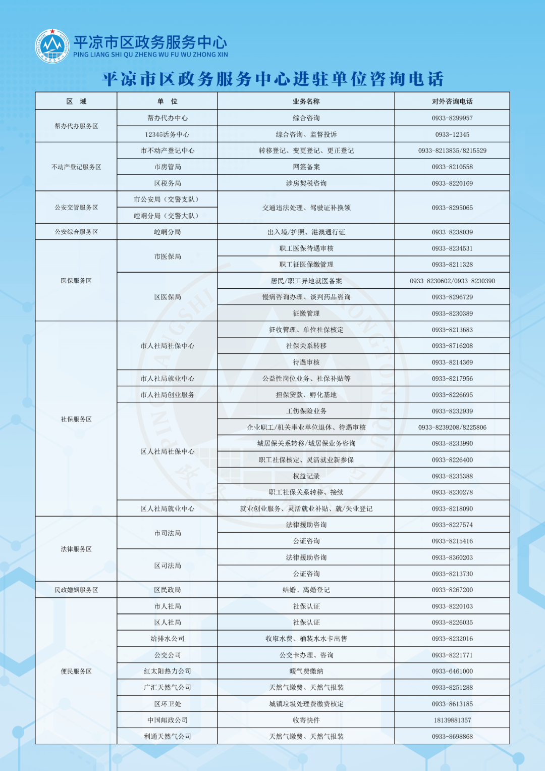 【转发收藏】平凉市区政务服务中心窗口咨询电话来啦!办事不跑冤枉路~