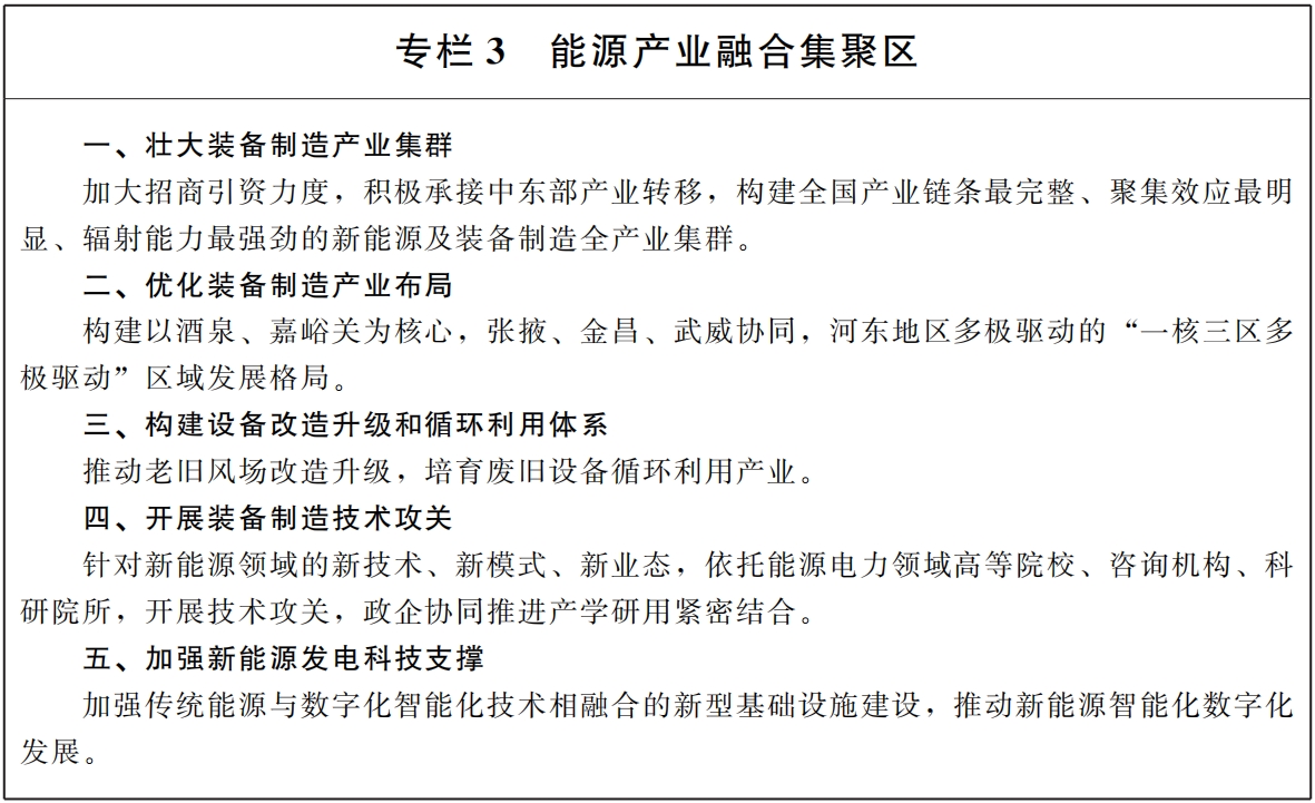 (十二)优化装备制造产业布局。坚持全省一盘棋,明确各地新能源装备制造产业发展重点,形成错位发展、各具特色的产业格局。以酒泉、嘉峪关为核心,打造中国西部链条最完整、聚集效应最明显、产能规模最大的风电、光伏、光热装备制造业基地;以酒泉、张掖、金昌、武威为重点,围绕绿氢生产及综合利用、储能装备制造、智能运维等领域延链补链;在兰州、白银、定西、天水等地区,以既有产业为依托,加快新能源装备制造产业布局,培育新能源轻型核心技术产业,形成全省新能源产业发展新增长极。(责任单位:省能源局、省发展改革委、省工信厅)