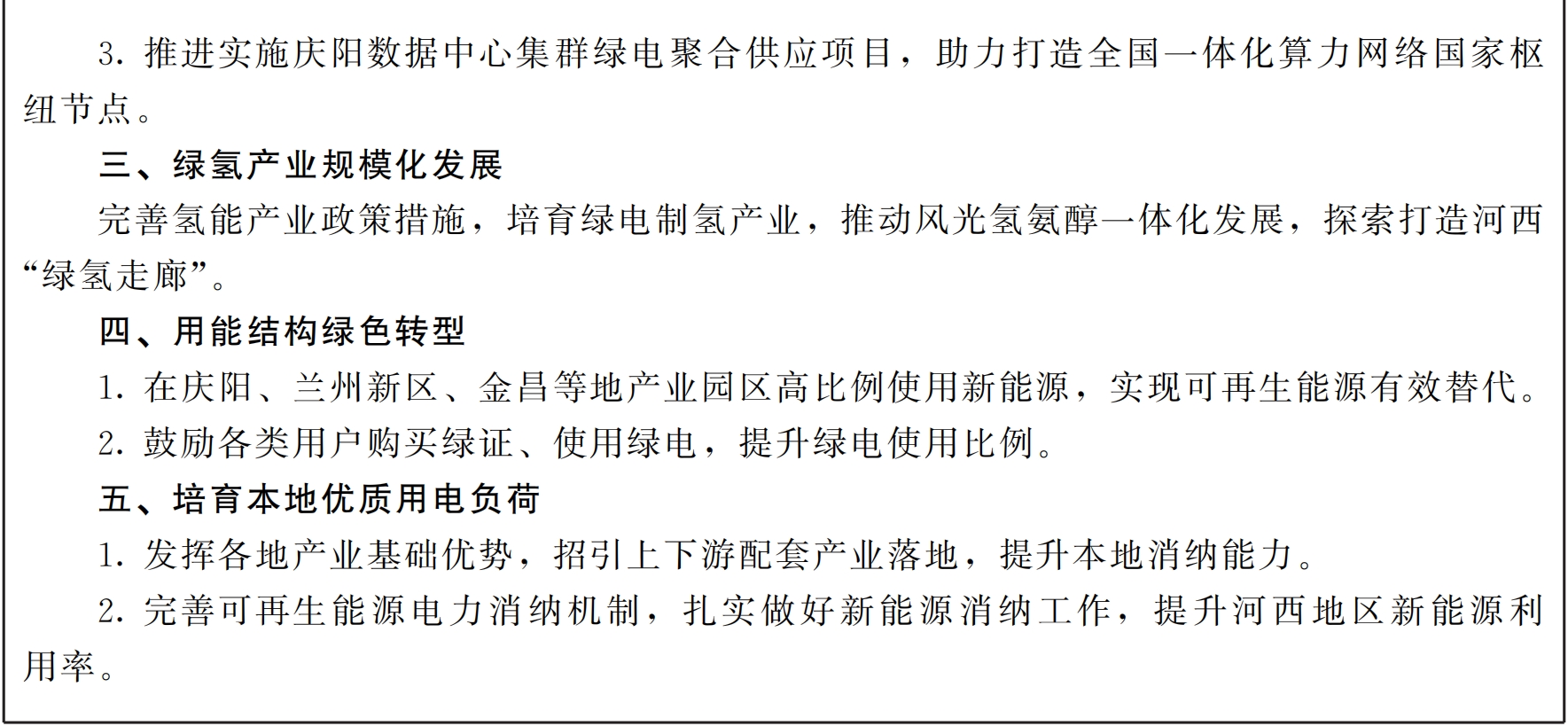 (十)培育本地优质用电负荷。深入实施“强工业”行动,依托甘肃全国老工业基地基础,发挥兰州石油化工、冶金建材、装备制造,白银铜铅锌有色金属、稀土材料,金昌镍钴及铂族金属,嘉峪关钢铁,天水机械电子,定西有色冶炼及建材等产业优势,招引有色金属、能源化工、装备制造、数据等产业落地,增加用电负荷,提升消纳能力。(责任单位:省商务厅、省工信厅、省发展改革委、省能源局)