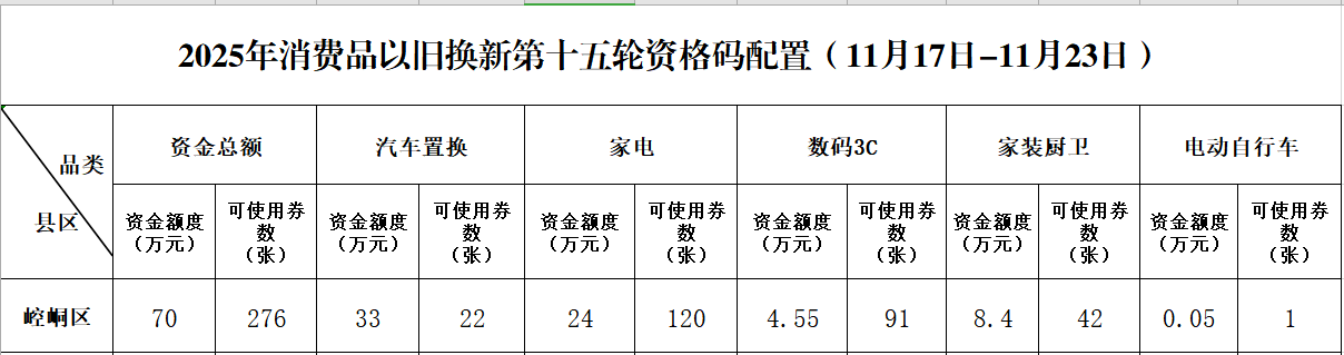 关于2025年消费品以旧换新崆峒区第十五轮资格码配置计划的公告