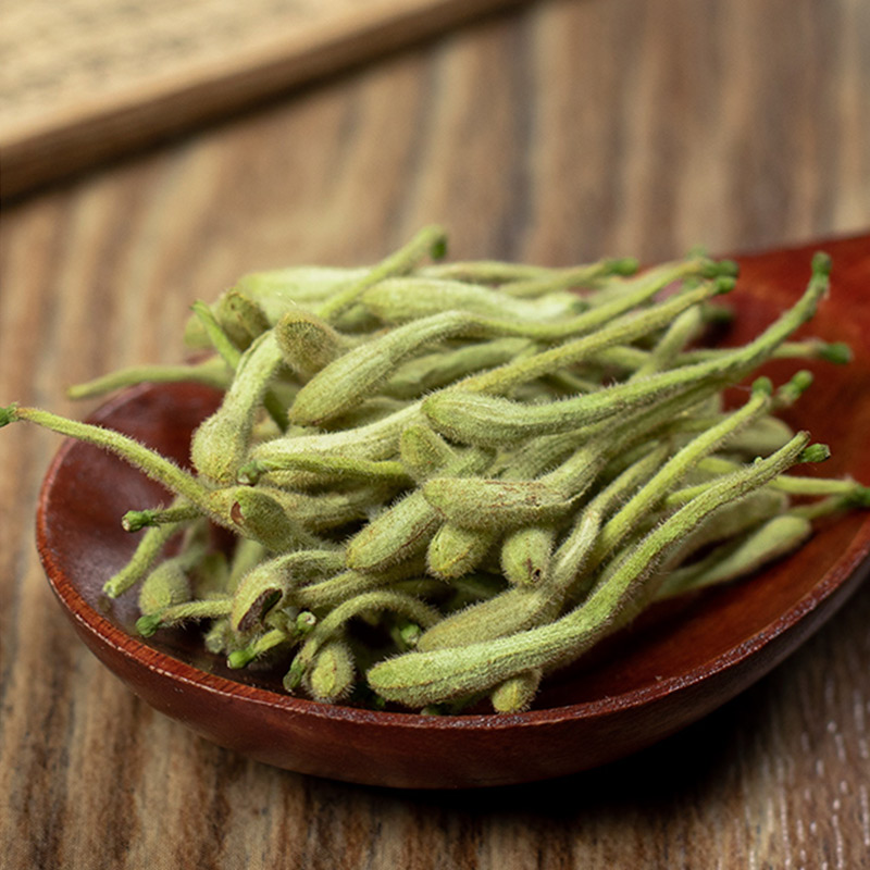 【产品简介】:金银花通常三月开花(花期4 - 6月且秋季也常开花),五出,微香,蒂带红色。花初开时色白,经一两日则色黄。又因一蒂二花,两条花蕊探在外,成双成对,形影不离,状如雄雌相伴,又似鸳鸯对舞,故有鸳鸯藤之称。金银花既是药品又是食品,可用于泡水、煲汤、熬粥等,如金银花茶、金银花水鸭汤、金银花炖猪展、金银花汤、金银花粥等。同时,它还可作为配料应用于烹饪料理中,也被应用于保健食品领域,但保健食品不能替代药物