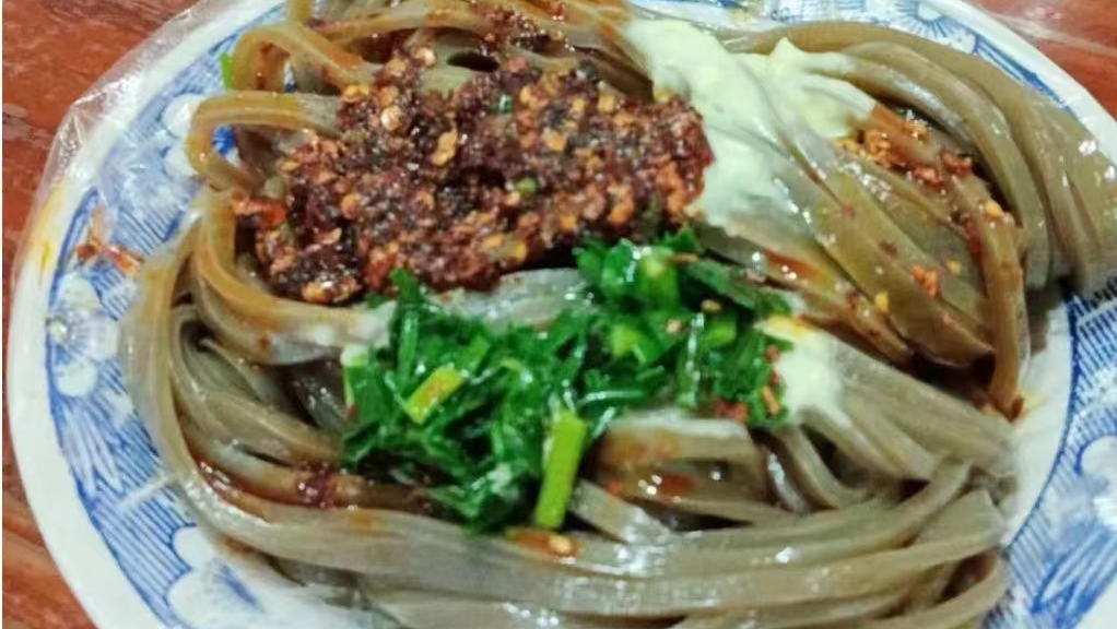 何为醋凉粉?顾名思义,此凉粉与醋有关。不知何时起,莲花人发现酿醋的醋糟中含有淀粉,弃之可惜。故而将醋糟置于盆中,注水成粘手状,装入纱布袋子,反复揉搓,析出的糊状沉淀物即为醋凉粉原料。加水和荞麦面调成糊状,舀入专用的面皮箩箩放入蒸锅中,漂在锅水面上,盖好锅盖,大约3分钟后关火。不急着取出,余热继续加热一分钟后取出放凉,将其揭下来即可。