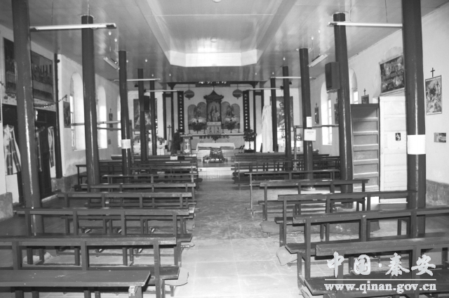 教堂建于民国9年(公元1920年),美国籍传教士艾嘉道神父来秦安传教,购得南下关成氏等民居设简易教堂。民国14年动工修建,民国18年竣工落成,耗资2万银元。殿堂的门窗为西欧教堂建筑式样,门窗上的图案精雕细刻,异常精美。教堂内木梁上还绘有一幅幅彩色图案,钟楼上雕刻的飞龙活灵活现,栩栩如生。