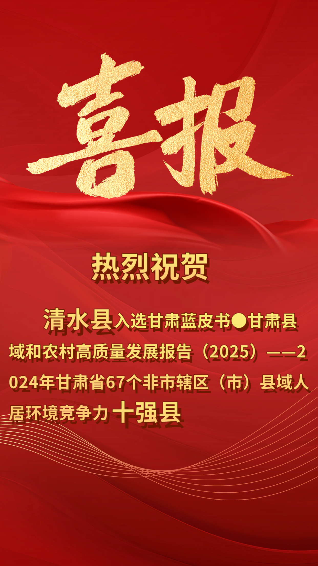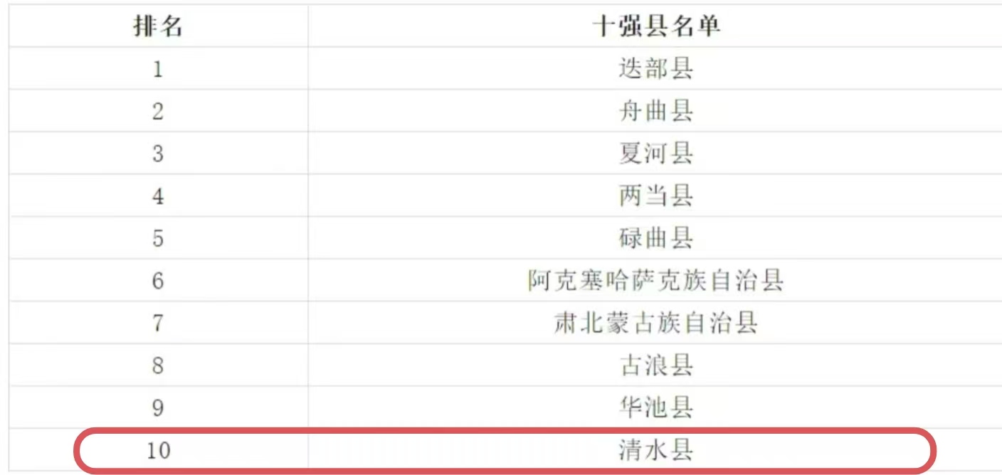报告针对全省67个县(市)人居环境竞争力下辖的生活环境竞争力、农业环境竞争力两个二级指标展开系统分析与测算,最终公布2024年全省67个非市辖区(市)县域人居环境竞争力榜单。清水县凭借显著的人居环境建设成效,成功跻身榜单前十名,充分彰显了清水县在生态治理、民生保障、乡村建设等领域的突出成果。