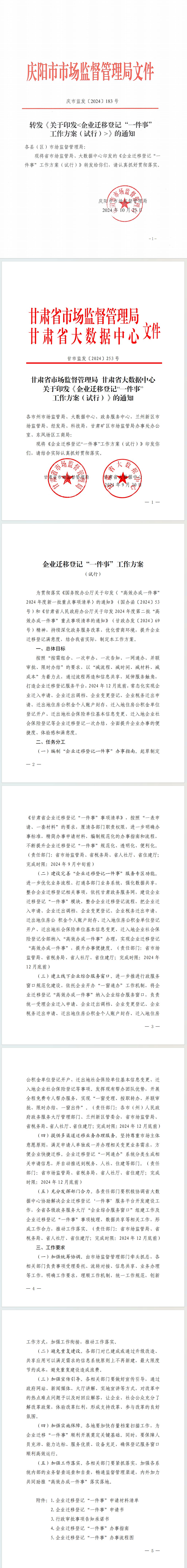 转发关于印发企业迁移登记一件事工作方案的通知(庆市监发﹝2024﹞183号)