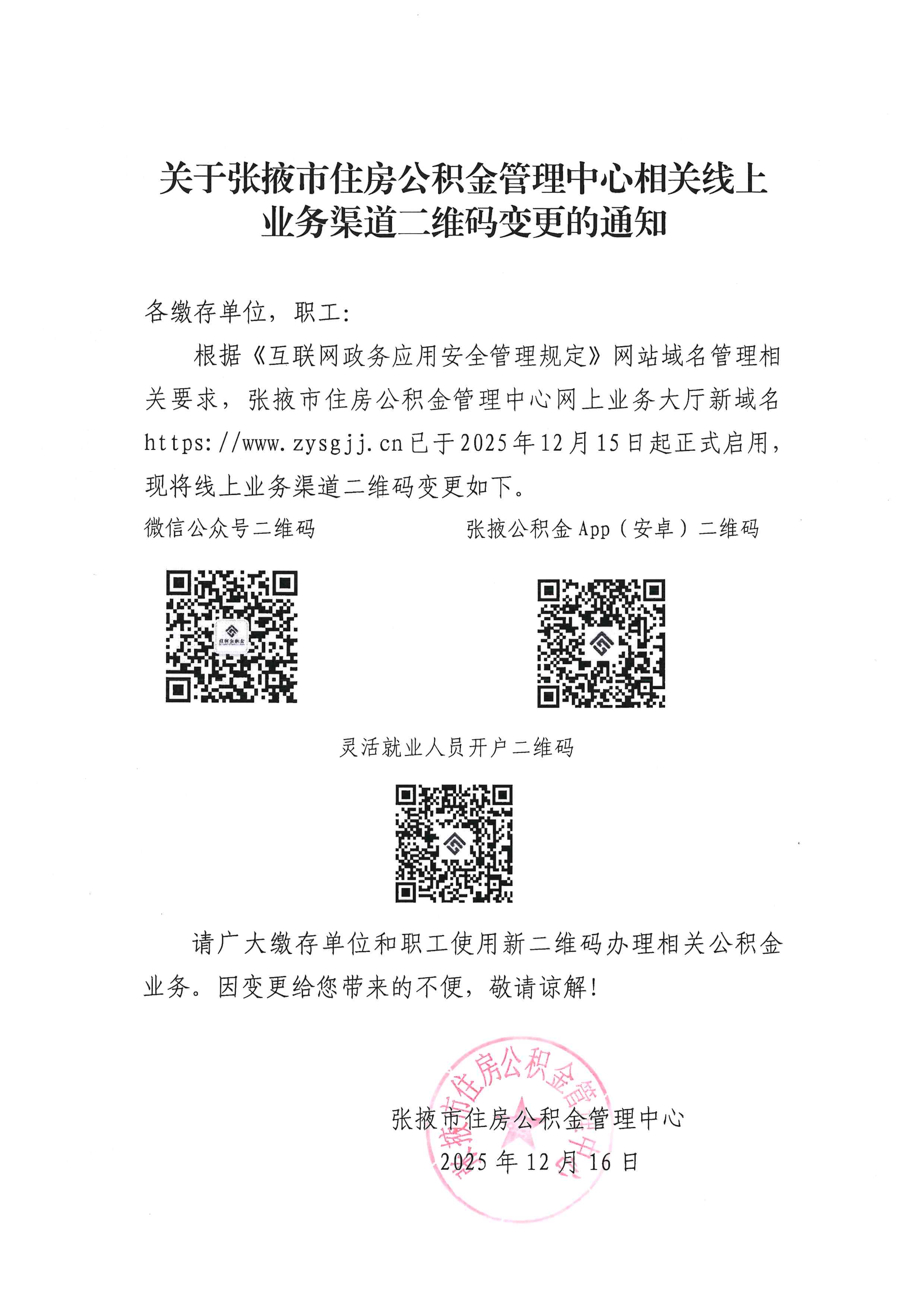 关于张掖市住房公积金管理中心相关线上业务渠道二维码变更的通知