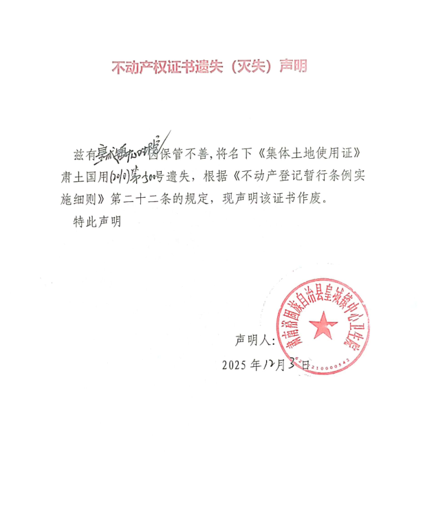 不动产权证书遗失(灭失)声明