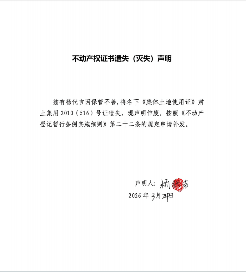 不动产权证书遗失(灭失)声明