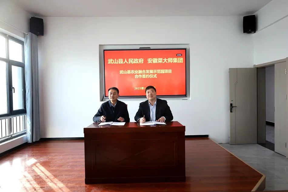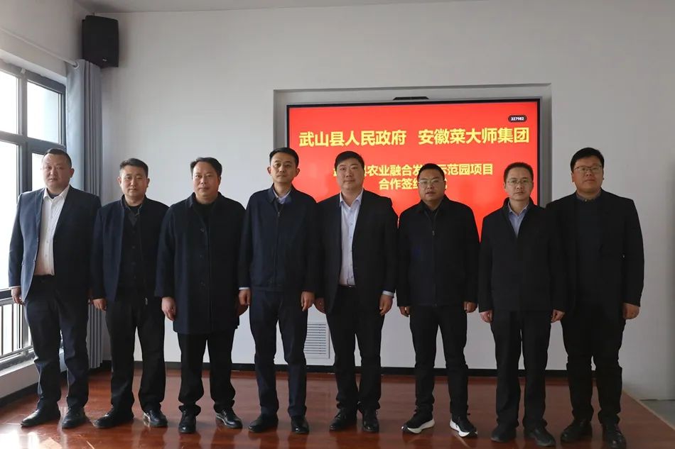新天水讯 据武山县融媒体中心消息 1月14日,县政府与安徽菜大师集团举行武山县农业融合发展示范园项目签约仪式,开启新的一年农业产业招商发展新篇章。安徽菜大师农业控股集团有限公司党委书记、董事长谭祖辉,县政府副县长王岩,安徽菜大师供应链管理有限公司总经理许红涛,武山菜大师食品有限公司总经理吴翔出席签约仪式,县直相关部门负责人参加签约仪式。