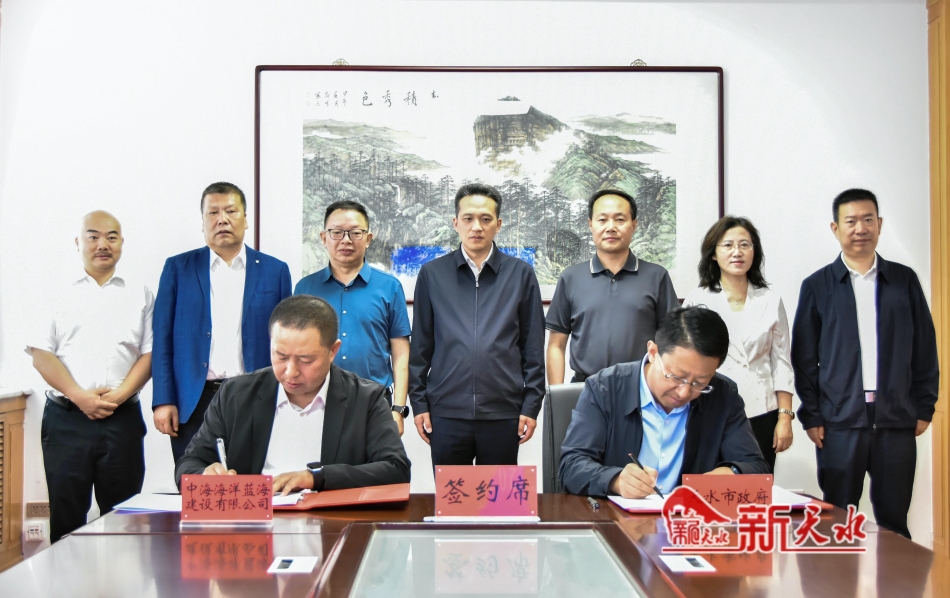 新天水讯【记者马放】5月28日,天水市政府与中海海洋蓝海建设有限公司签署战略合作框架协议。市委常委、常务副市长张晓强,中海海洋蓝海建设有限公司董事长李汉勇出席签约仪式并代表双方签约。中海海洋蓝海建设有限公司副总经理陈静,文旅产业研究院院长黄彤,副市长储著贞,市政府秘书长马军胜参加签约仪式。