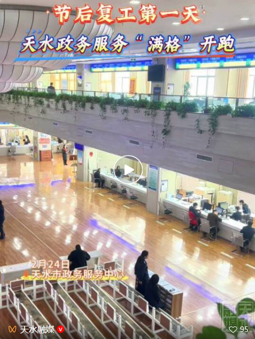 2月24日,农历正月初八,春节的喜气还未完全散去,天水市政务服务中心大厅内已是一片忙碌而有序的景象。上午八点半,中心45个窗口、120名工作人员全部到岗,迅速进入工作状态,以饱满的热情迎接每一位办事群众。