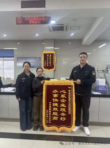 锦旗凝赞誉,砥砺再前行。锦旗上的赞誉,既承载着办事群众的真挚感谢,也彰显了窗口在助企服务工作中始终坚守的高效与温度。秦安县政务服务中心市场监管窗口负责人表示,今后将以此为契机,进一步总结服务经验,持续提升服务质效,不断优化服务举措,以更专业的能力、更贴心的态度、更高效的行动,切实为企业和群众办实事、解难题,用真情服务架起政企“连心桥”,为优化秦安县营商环境、激发市场主体活力注入源源不断的政务服务力量。