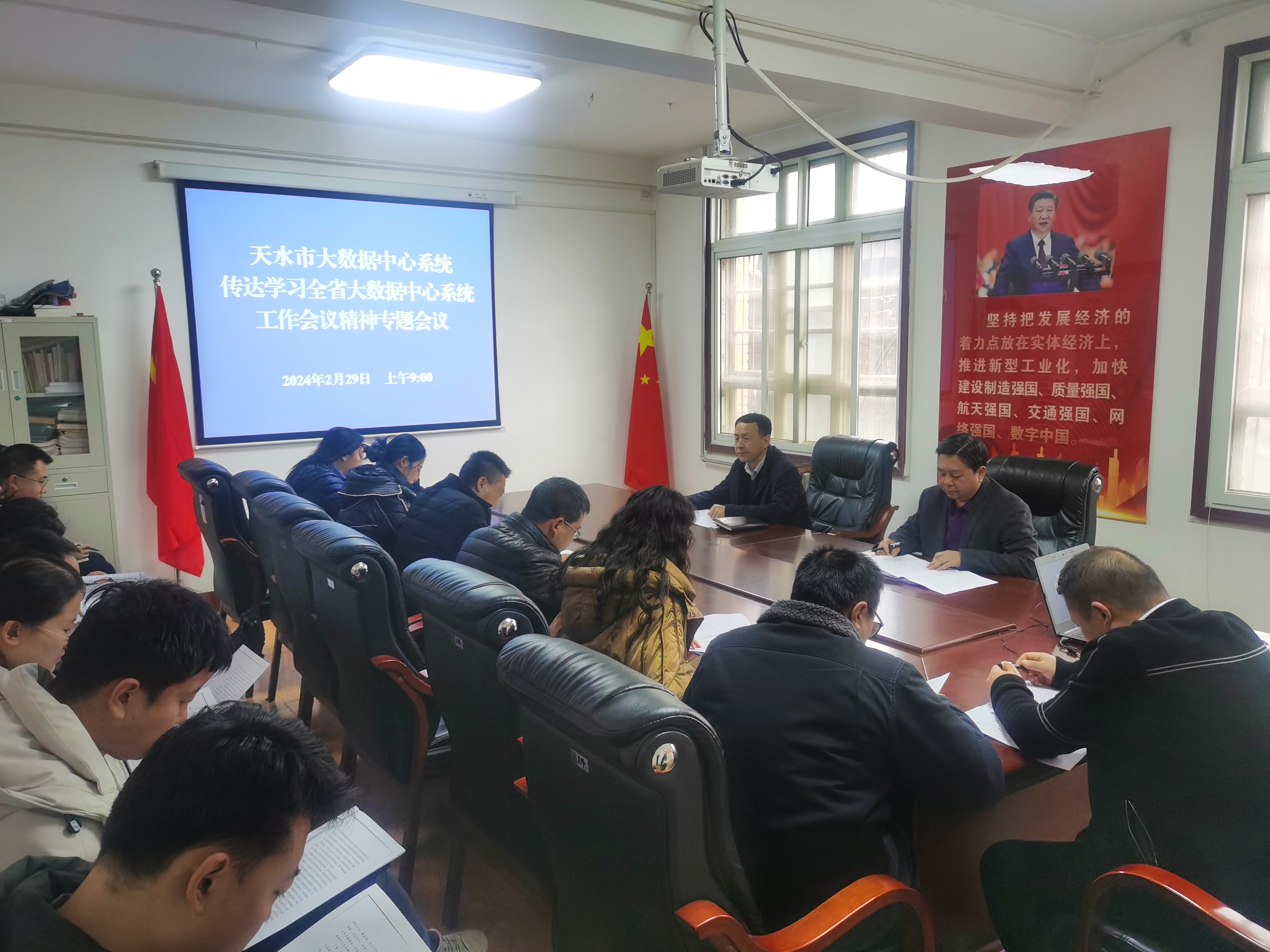 2月29日上午,天水市大数据中心组织召开专题会议传达学习全省大数据中心系统工作会议精神,研究贯彻落实意见。党组书记、主任冯建新主持会议并讲话,党组成员、副主任王智峰和中心全体干部及中国移动天水分公司、中移集成公司项目负责人参加会议。
