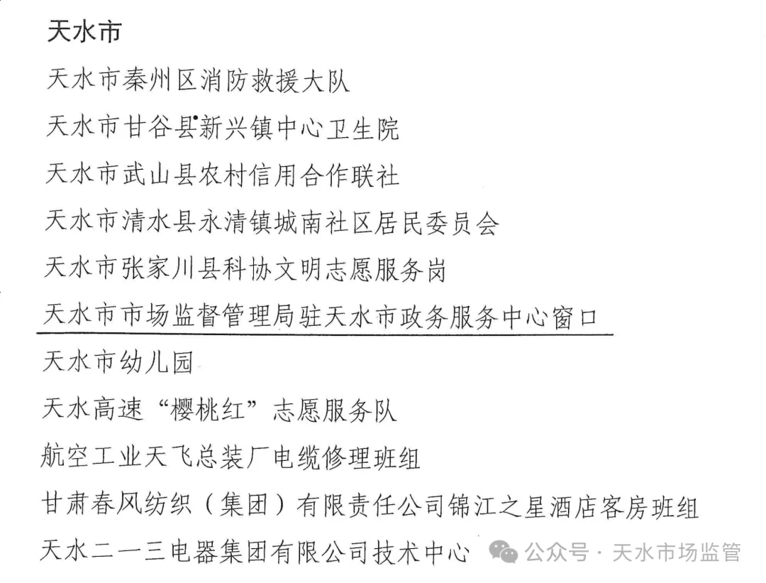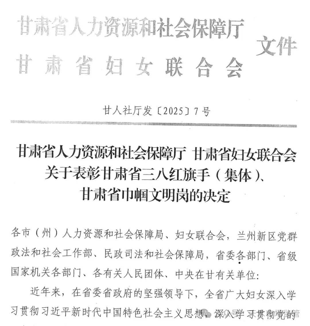 近日,甘肃省人力资源和社会保障厅、甘肃省妇女联合会联合印发《关于表彰甘肃省三八红旗手(集体)、甘肃省巾帼文明岗的决定》,天水市市场监督管理局驻天水市政务服务中心窗口被授予“甘肃省巾帼文明岗”荣誉称号。