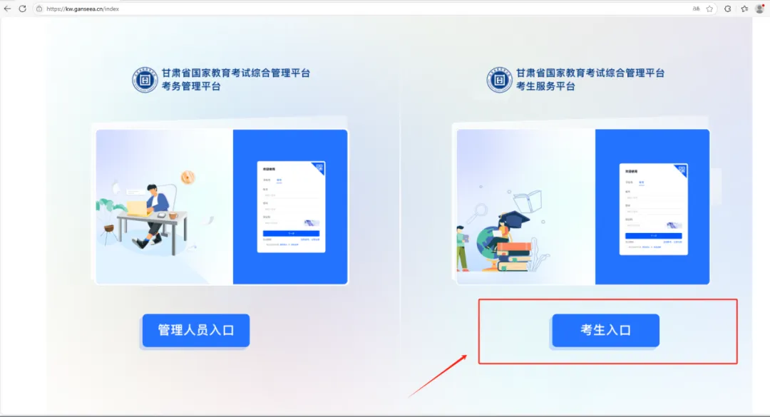 1、使用电脑浏览器进入甘肃省国家教育考试综合管理平台考生服务端,使用微信扫码或输入账号密码登录。