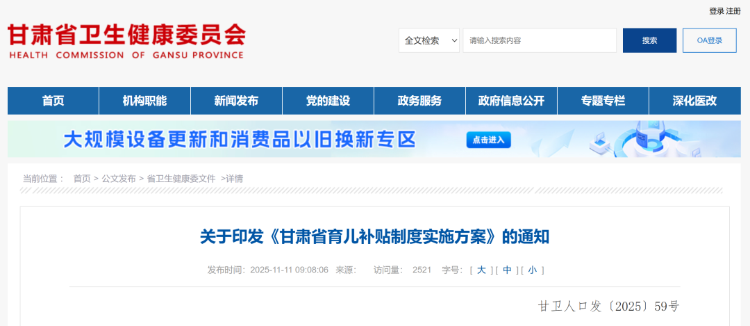 为进一步规范育儿补贴申领、发放、管理等工作,近日,甘肃省卫健委、省财政厅印发《甘肃省育儿补贴制度实施方案》《甘肃省育儿补贴制度管理规范实施细则(试行)》,明确了补贴标准、申领流程等内容。自2025年1月1日起,户籍在甘肃的3周岁以下符合法规生育的婴幼儿,可获每孩每年3600元的育儿补贴,该补贴发放至婴幼儿年满3周岁。