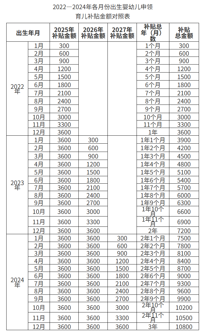 第一条 本实施细则所称育儿补贴制度,是指国家为支持家庭抚育婴幼儿,降低生育、养育成本,由中央、省和市县财政安排资金,对符合条件的婴幼儿按照一定标准发放补贴的制度。 第二条 各级卫生健康行政部门负责育儿补贴制度的组织实施;各级财政部门负责及时足额安排育儿补贴资金;金融代理发放机构要按照代理服务协议,确保育儿补贴资金及时足额发放到人。 第三条 本实施细则所称符合条件,是指户籍在甘肃省行政区域内,且应符合以下条件之一: (一)从2025年1月1日起,符合法律法规规定生育或收养的3周岁以下婴幼儿。 (二)3周岁以下的孤儿、事实无人抚养的婴幼儿。 第四条 按照《甘肃省人口与计划生育条例》一对夫妻可以生育三个子女。子女数按以下原则进行计算: (一)夫妻在婚姻关系存续期间的亲生子女,计算子女数; (二)夫妻在办理结婚登记之前或复婚夫妻在复婚之前,生育的与双方均有血缘关系的亲生子女,计算子女数; (三)婚姻存续期间依法采用人类辅助生殖技术生育的与夫妻一方或双方无血缘关系的子女,视为夫妻双方的亲生子女,计算子女数; (四)再婚夫妻再婚前生育的子女,不计算子女数; (五)已死亡的子女或失踪且经法定程序宣告死亡的子女,不计算子女数。 有以下情形之一的婴幼儿,可享受育儿补贴,不受子女数不超过三个的限制: (一)夫妻共同生育三个子女,其中有子女经鉴定为残疾的,依法再生育相同数量子女的; (二)政策内生育多胞胎的; (三)合法收养或儿童福利机构抚养的婴幼儿。 第五条 育儿补贴按年计算,每年一次性发放,按照每孩每年3600元标准执行。 对于2025年1月1日及以后出生的婴幼儿,可连续申领3年补贴,共计10800元。 对于2025年1月1日之前出生且未满3周岁的婴幼儿,可按应补贴月数折算补贴金额。先申领整年补贴,再申领剩余月份补贴,具体算法见附表《2022—2024年各月份出生婴幼儿申领育儿补贴金额对照表》。 第六条 育儿补贴由婴幼儿父母一方或其他监护人(含儿童福利机构)申领,用于育儿相关支出。 第七条 育儿补贴具体申请程序如下: (一)申请提交。申领人在规定时限内通过线上或线下渠道提交申请。线上申请可通过支付宝、微信平台“育儿补贴”小程序,或“甘快办”APP(支付宝和微信“甘快办”小程序)首页进入育儿补贴申领专区,登录“育儿补贴信息管理系统”,如实填写婴幼儿及申领人有关信息,提供婴幼儿的出生医学证明、居民户口簿等基础材料,并根据需要提供有助于判定申领人和婴幼儿之间抚养关系的法定有效材料。线下申请可到婴幼儿户籍所在地乡镇人民政府(街道办事处)现场办理。 申领人是儿童福利机构的,应到机构登记所在地乡镇人民政府(街道办事处)现场申请,并提供所需材料的原件及加盖公章的复印件,以及办理人的身份证明材料原件。 (二)乡级初审。乡镇人民政府(街道办事处)应在15个工作日内对申请信息进行初审。符合条件的予以通过,并提交县级卫生健康行政部门审核;不符合条件未通过的,应一次性告知申领人需补正的资料或不符合申请条件的原因,并做好政策解释。村(居)民委员会协助做好有关工作。 (三)县级审核确认。县级卫生健康行政部门应在15个工作日内对乡镇人民政府(街道办事处)提交的资料进行审核、确认补贴发放对象名单,按程序将相关信息提供给同级财政部门。审核未通过的,退回乡镇人民政府(街道办事处)并说明原因,按乡级初审未通过流程办理。 第八条 首次申请时需提交相关材料;申领相关信息和材料的审核以申领人提交申请时的状态为准;发生修改的,以最后一次修改后提交时的状态为准。 申请相关材料主要包括: 1.婴幼儿有关材料: 《出生医学证明》《居民户口簿》首页及婴幼儿页。 2.申领人有关材料: (1)申领人为婴幼儿亲生父母的:如婴幼儿亲生父母已婚,需提供结婚证。如离异,提供离婚证及离婚协议(或离婚调解书、生效的裁判文书等法定有效材料),应体现婴幼儿抚养权有关信息;如丧偶,需提供申领人配偶有关信息;如属其他情形,需提交有关情况说明,请申领人说明和婴幼儿的监护抚养关系,签字后上传。 (2)申领人为婴幼儿养父母的:需提供《收养登记证》或民政部门认可的其他合法收养证明材料。 (3)申领人为其他监护人的:其他监护人包括顺位监护人、指定监护人和儿童福利机构。分别需提供以下材料: ①顺位监护人:婴幼儿父母死亡证明(医疗机构、公安机关或法院出具)或者丧失行为能力的认定材料(医疗机构精神疾病诊断证明或伤残鉴定报告、法院出具的无民事行为能力判决书)、顺位监护人与婴幼儿亲属关系佐证材料。 ②指定监护人:婴幼儿住所地的居委会、村委会或民政部门、人民法院出具的婴幼儿指定监护人的佐证材料。 ③儿童福利机构:机构法人证书、法人代表的身份证明材料、机构集体户口簿首页和婴幼儿页(如婴幼儿户籍未在集体户口上的,需提供监护权佐证材料)。同时,需携带加盖该机构公章的《育儿补贴申请表》。 第九条 申领人应对所提供信息及材料的真实性、完整性作出承诺,并负相应法律责任。审核工作要充分发挥大数据审核作用,申领人上传的材料仅作备查,切实减轻基层负担。申领人提供的信息与大数据比对不一致的,县乡应重点核查,最终以人工审核为准。 第十条 申领人按年度申请育儿补贴。逾期未提交