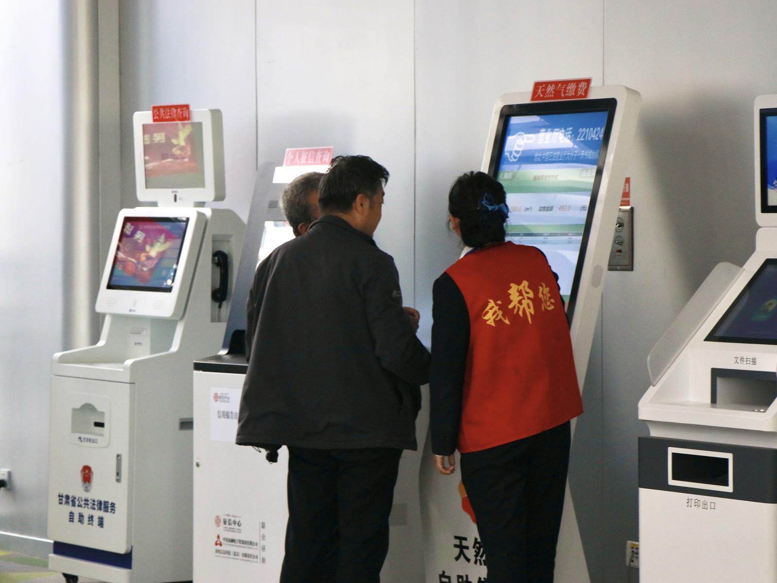 走进武威市政府政务服务中心,身着红马甲的“帮办代办”工作人员立马微笑着迎上来,帮助前来办事的群众和企业代表取号、打印、复印等,并提供惠企政策信息、信用查询等服务。