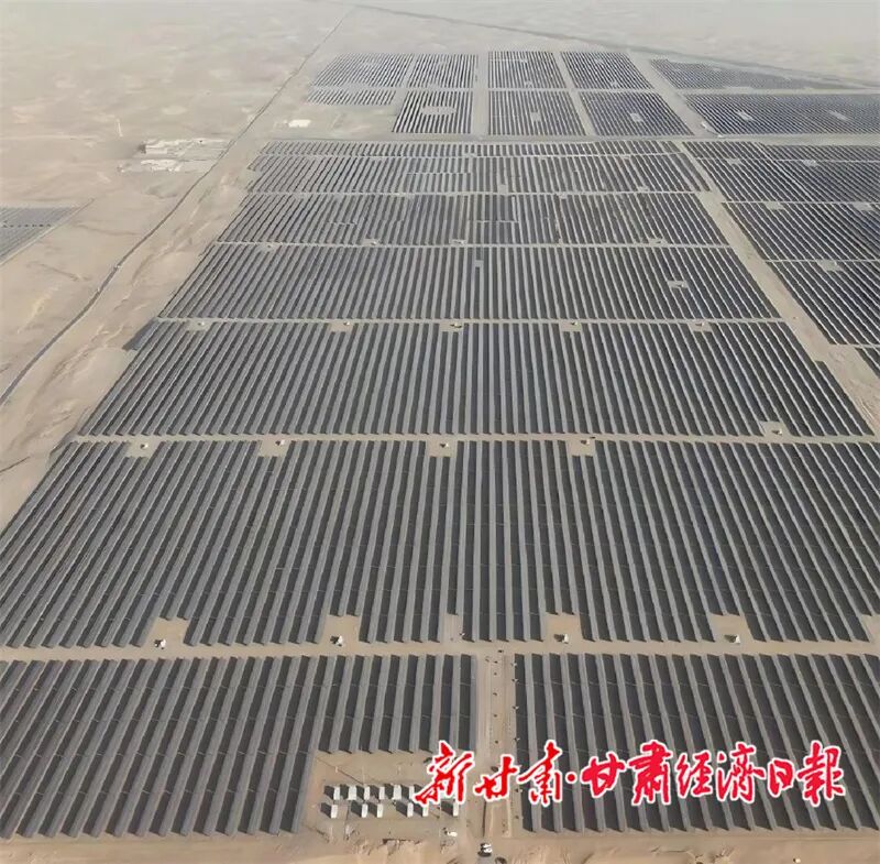 该项目位于武威市凉州区九墩滩光伏治沙示范基地、腾格里沙漠南缘,由甘肃电投集团投资、甘肃电投酒汇公司代建,总装机容量100MW,直流侧装机120MW,配套建设15MW/60MWh电化学储能系统,占地约2300亩。项目采用高效双面双玻光伏组件、智能组串式逆变器等先进设备,依托储能系统协同调度,有效提升电力输出稳定性与电网消纳能力,兼具技术先进性、系统集成性与生态友好性;配套储能系统同步投运,进一步增强了调峰调频和电网支撑能力,提升了可再生能源利用效率与电力系统安全稳定运行水平。