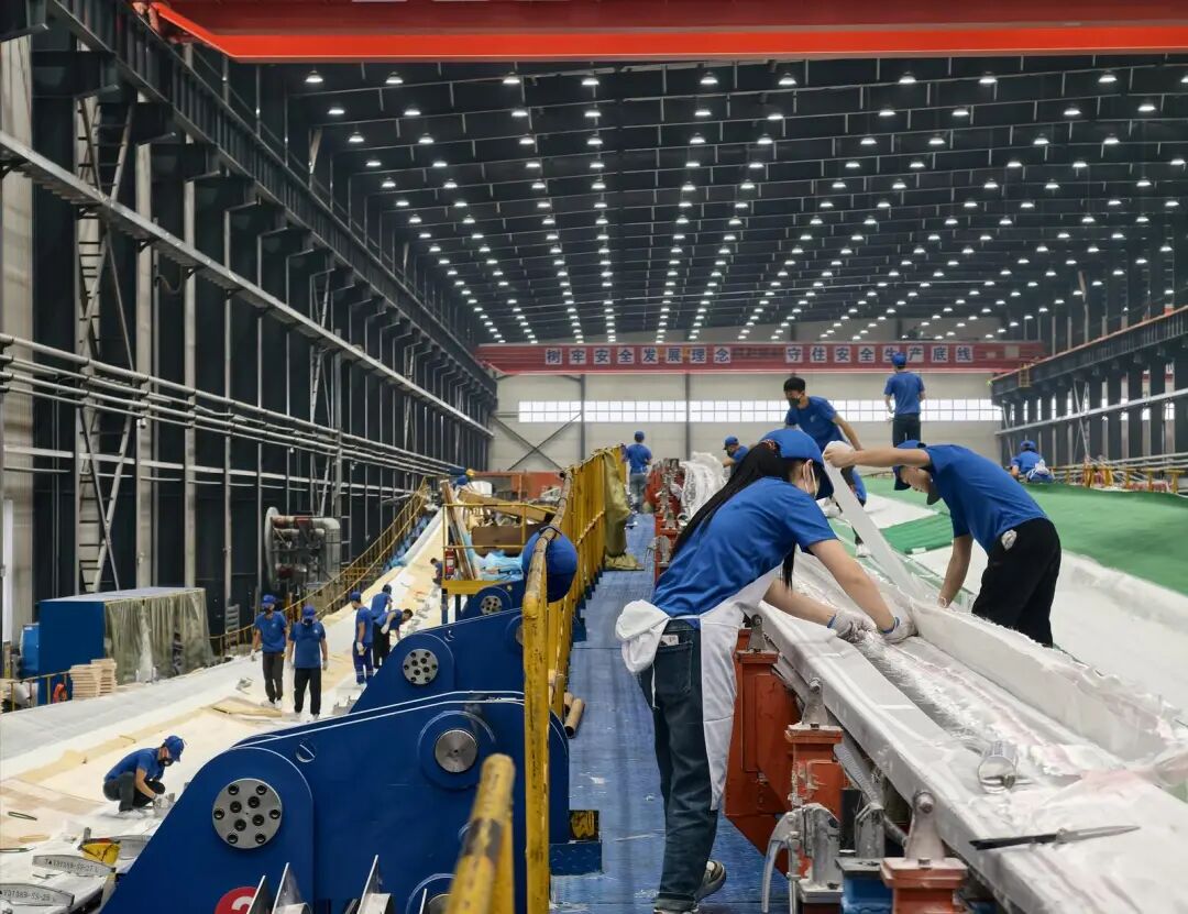 走进凉州工业园区,甘肃重通成飞新能源新材料有限公司的生产车间里,一派热火朝天的忙碌景象。生产车间内,8条生产线满负荷运转,从玻纤布精准铺层,环氧树脂均匀灌注,再到模具合模固化,一道道工序衔接紧密、环环相扣。30小时左右,一支长达112米的风电叶片就能顺利下线。