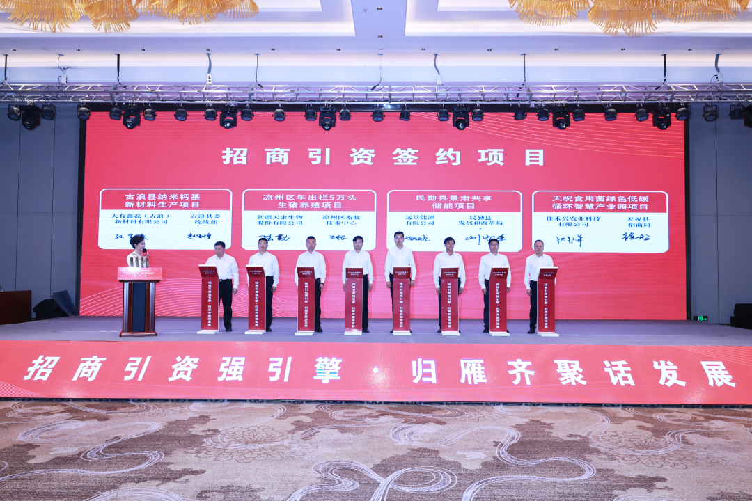 王国斌说,我们将深入学习贯彻习近平总书记视察甘肃重要讲话重要指示精神,认真落实省委对武威提出的“走在前、干在先,勇当全省高质量发展生力军”总体要求,积极融入全省“七地一屏一通道”建设,聚力打造链条完备集群发展的“产业之城”、蓬勃发展环境一流的“活力之城”、绿色低碳和谐共生的“生态之城”、宜居宜业社会稳定的“幸福之城”,加快建设“两区两地”,加速构建“两擎牵引、五极迸发”高质量发展格局,奋力谱写中国式现代化武威篇章。真诚希望在外武威籍人士充分发挥各自优势,在产业发展、基础建设、人才引进、生态保护等方面献计献策,做家乡发展的最强合伙人、最智赋能者、最美代言人,为推动家乡现代化建设作出更大贡献。市委、市政府将始终以最优质的服务、最有力的保障,让大家投资放心、创业舒心、生活安心,携手开创武威更加美好的明天。恳谈会后,举行了招商推介会和项目签约仪式,各县区、市文旅局、武威重离子中心主要负责人作了项目推介;向武威市招商大使颁发了聘书。此次招商活动,共洽谈对接招商引资项目41项,签约金额185亿元,其中合同项目91.92亿元,项目涵盖新能源及装备制造、新材料、特色农产品及食品加工、文化旅游等多个领域。