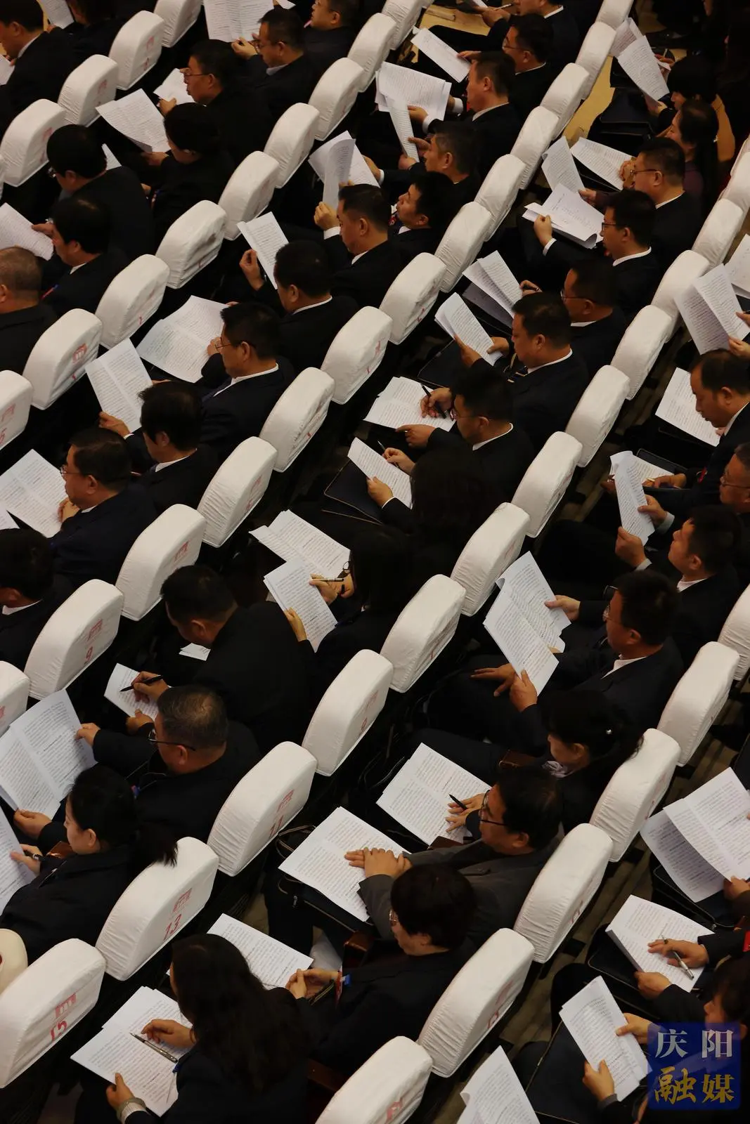 会场内气氛庄重热烈。中国人民政治协商会议会徽悬挂在主席台正中,十面鲜艳的红旗分列两侧。会场内高高悬挂着大红横幅:高举伟大旗帜,汇集民智担当,同心奋进谱写中国式现代化庆阳实践新篇章。