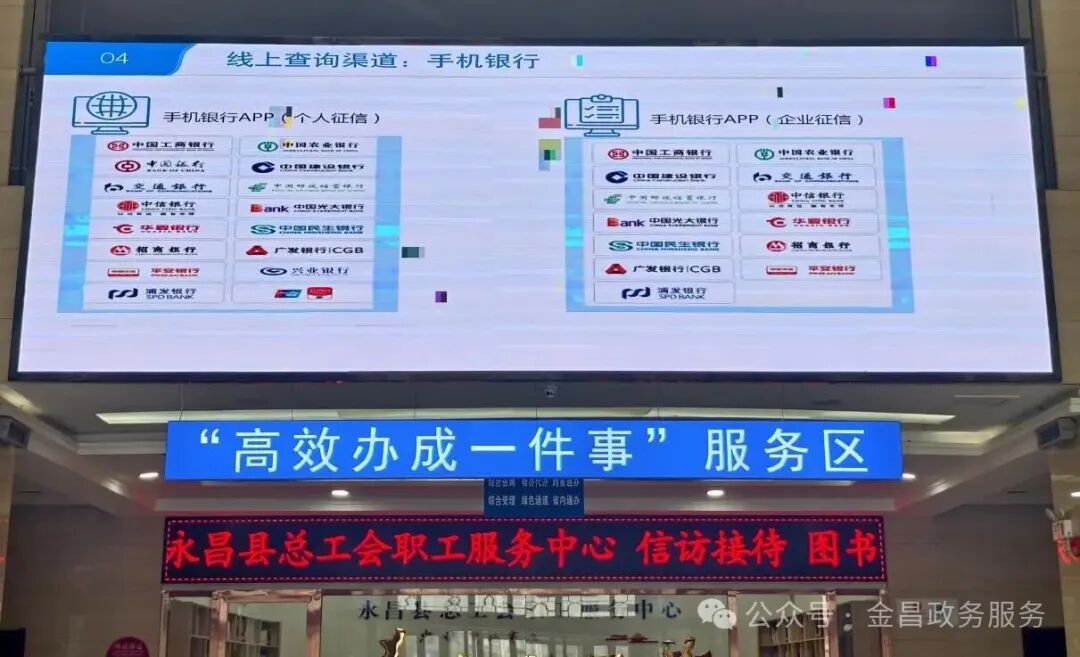 永昌县政务服务大厅充分利用入口处LED 电子大屏持续滚动播放征信查询服务指南,内容包括线上查询渠道和方法,及线下查询渠道和查询网点等信息,搭配 “优化政务服务,践行征信便民”的醒目标语,营造了浓厚宣传氛围。同时,现场工作人员主动提供引导服务,确保群众进入大厅就能快速了解征信查询相关服务内容,有效提升了服务知晓率。