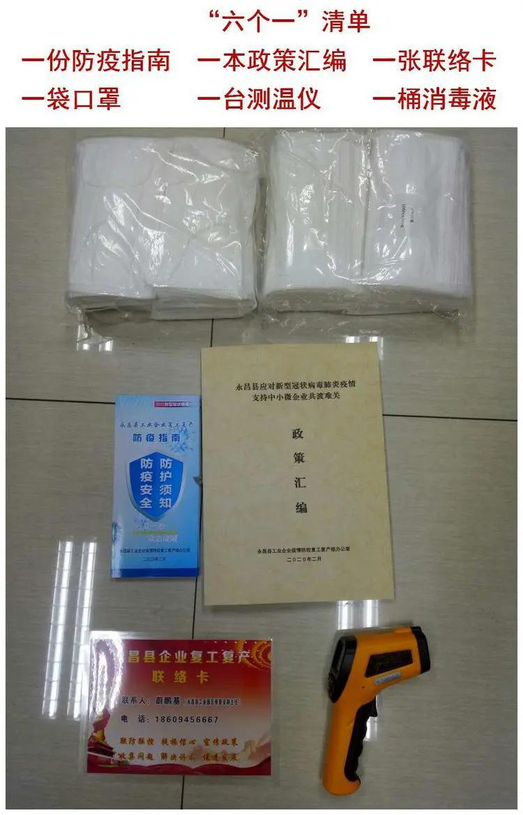 一袋口罩、一台测温仪、一桶消毒液:面对防疫物资极为紧缺的困难,县疫情防控医疗物资保障组急企业之所急、谋企业之所盼、解企业之所困,千方百计采购防疫物资,为41家重点工业企业配放一次性口罩5530个、手持式红外线测温仪50个、次氯酸钠消毒液2050斤,解决了企业复工复产防疫物资紧缺的燃眉之急,全力保障工业企业稳妥复工复产。