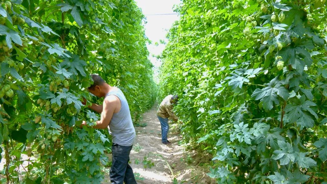 玉门地处北纬39度至41度间,日照长、温差大、光热条件优越,成为啤酒花生长的“黄金带”。眼下,正是啤酒花生长的关键期,玉门市万亩啤酒花长势喜人,丰收在望。 啤酒花被称为啤酒的灵魂,玉门因其独特的种植优势,是公认的啤酒花理想种植基地之一,这里种出的啤酒花品质好,深受市场喜欢,在绿鑫集团黄花种植基地,这两天啤酒花已经进入了花体膨大期,一簇簇啤酒花缀满枝头,靠近还带着一阵阵醉人的芬芳。 啤酒花长势喜人,离不开科学精细的管护。为确保每一朵小花茁壮成长,工人们加强田间管理,及时灌溉施肥,并严格防控病虫害。 甘肃亚盛绿鑫啤酒原料集团有限责任公司黄花分公司副经理崔亚鹏:“主要的田间管理就是打空秧子,疏老叶,把没有结花的这些空枝打一下,促进酒花的生长。” 在科学管护下,翠绿的啤酒花藤蔓沿着支架茁壮生长,一串串嫩绿的花穗垂挂枝头。这些被誉为“绿色黄金”的啤酒花将于八月中旬迎来丰收,并通过订单销往青岛啤酒、华润雪花、燕京啤酒等国内大型啤酒生产企业。 甘肃亚盛绿鑫啤酒原料集团有限责任公司黄花分公司经理周宝德:“今年我们公司在玉门片区整个种植啤酒花是将近一万亩,今年酒花长势是历年来最好的一年,比往年预计增产20%到30%。” 花开正艳,香气四溢,如今,玉门成为西北重要的啤酒花种植基地,这片戈壁绿洲,正在书写着自己的产业“醇香”。