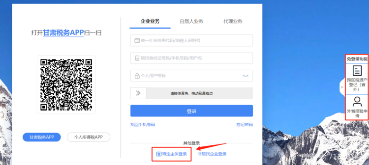 未实名登记的企业,须在新版右边“免登录”功能选择“跨区域税源户登记、外省报验申请”完成登记后使用“特定主体登录”进行登录,再办理业务。