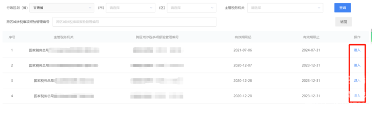 3.您可在登录成功后,选择需要办理的跨区域报验户或者跨域税源登记地,也可以通过行政区划进行筛选,跨区域报验户可通过税源编号快速查找,点击“进入”办理涉税业务。