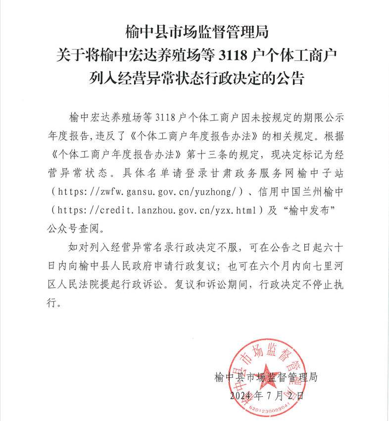 榆中县市场监督管理局 关于将榆中宏达养殖场等3118户个体工商户列人经营异常状态行政决定的公告