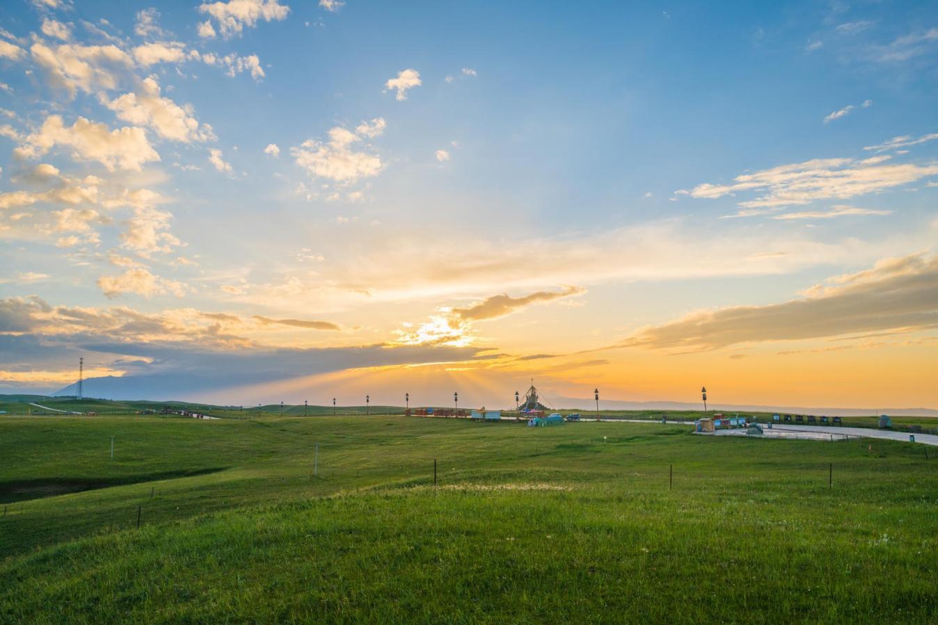 迎着朝阳,来到康乐草原(空中草原),广袤无垠的草原与蓝天白云无缝对接,仿佛一幅巨大的绿色画卷在您眼前徐徐展开。