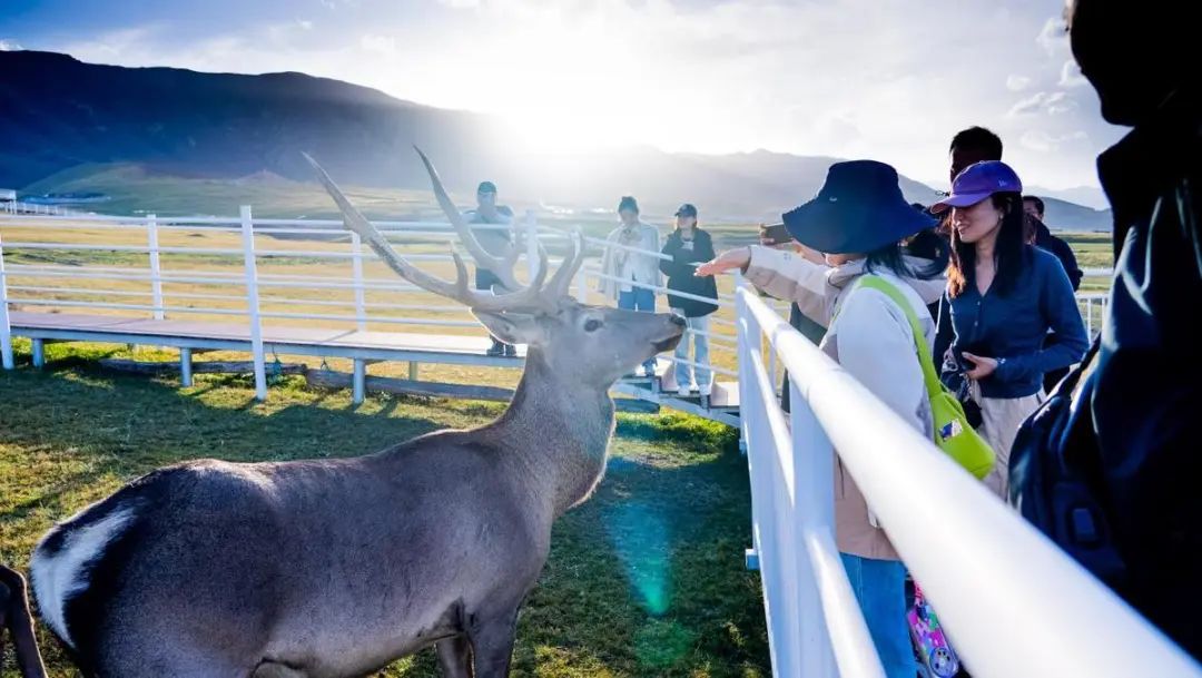 来到肃南祁连山鹿文化生态旅游景区(世外鹿苑)。在这里,可以与祁连山的精灵来一场亲密接触,草原旖旎、马鹿温顺,远处雪山遥遥呼应,“呦呦鹿鸣,食野之苹”,在这里都有迹可循。